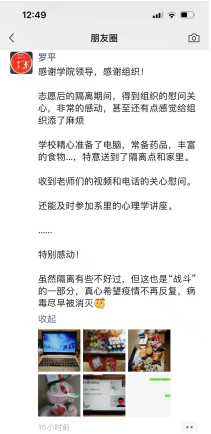 学院领导的慰问和关心让罗平老师倍感温暖和鼓舞,罗平老师表示:“非常感谢学院领导的关心,我认为这一切都是应该的。接下来我一定会再接再厉,在做好本职工作的同时,积极响应党和国家的号召,为早日打赢疫情防控歼灭战,贡献自己的一份力量!”