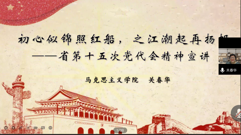 关春华博士对省第十五次党代会精神的宣讲,让我们更进一步学习和理解了省党代会的精神实质、丰富内涵和实践要求,为持续推进双学双融、人才培养和社会服务工作,实现“两个先行”目标贡献财浙力量,以实际行动迎接党的二十大胜利召开。