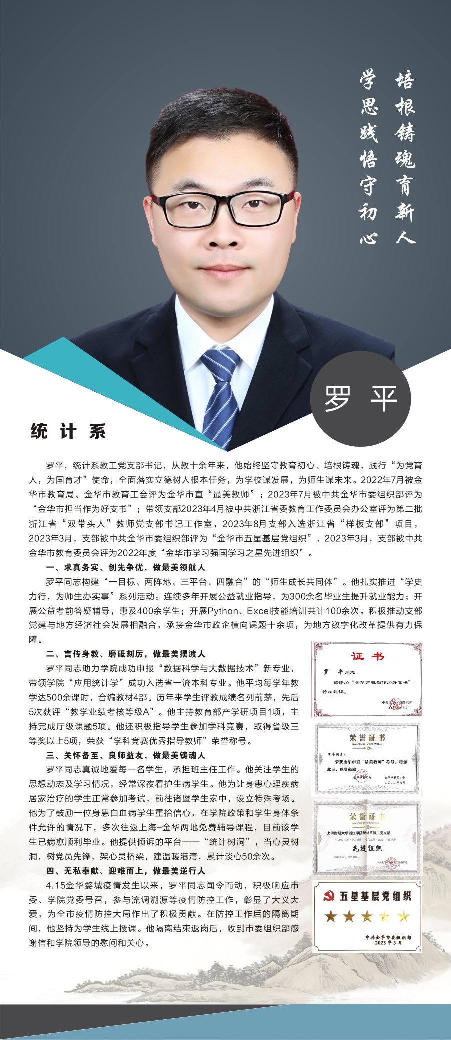 党的十八大以来,统计系党总支始终坚持立德树人的根本任务,以“四有好老师”为标准,不断加强师德师风建设,时刻践行以文化人、以德育人,提高学生思想政治素质,努力培养德才兼备、全面发展的优秀人才。